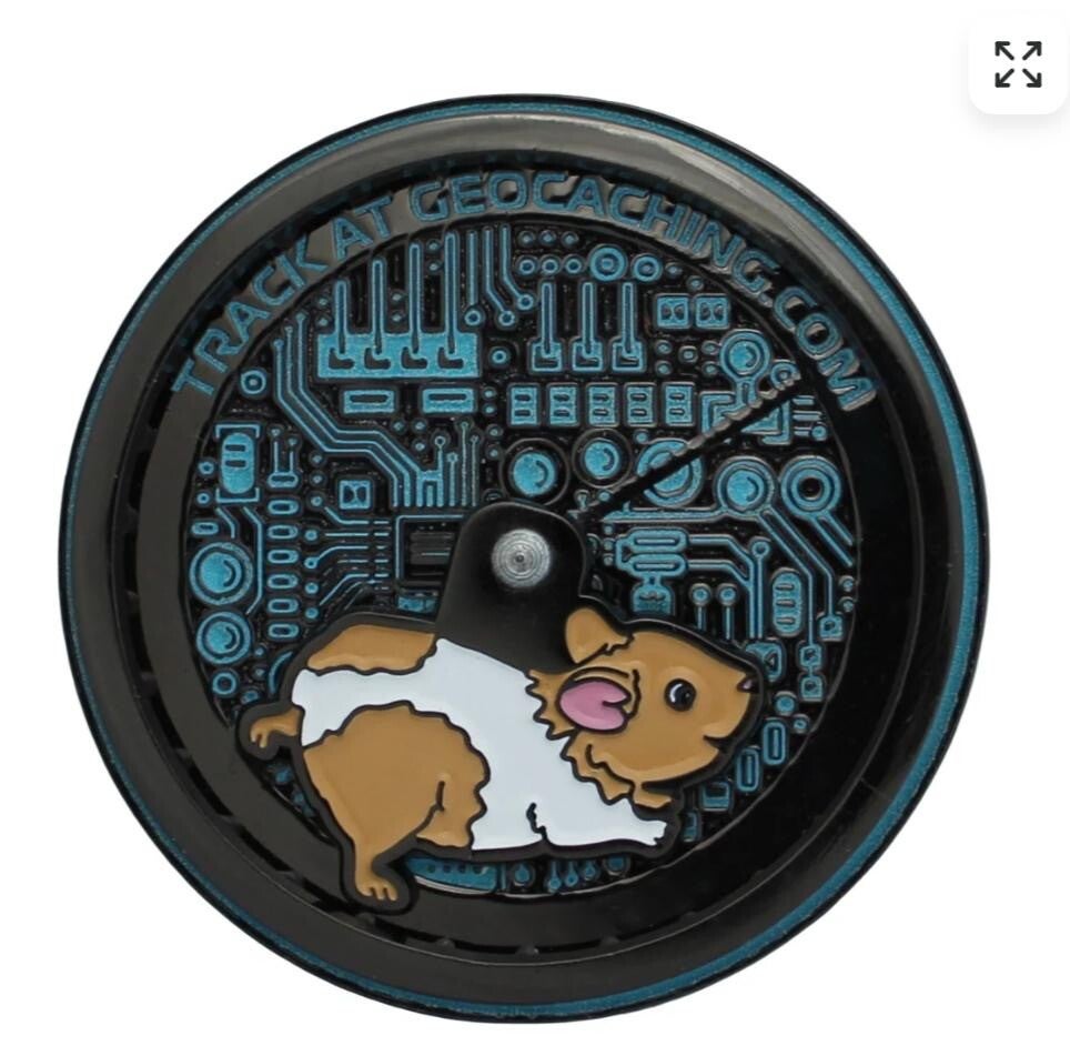 Deze unieke geocoin heeft een statisch "wiel" aan de zijkant, en de hamster kan erop draaien